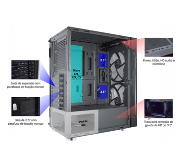 Compatível com placas ATX, Micro ATX e ITX, conta com slots de expansão de fácil acesso e baias para SSD e HDD, garantindo flexibilidade para upgrades.