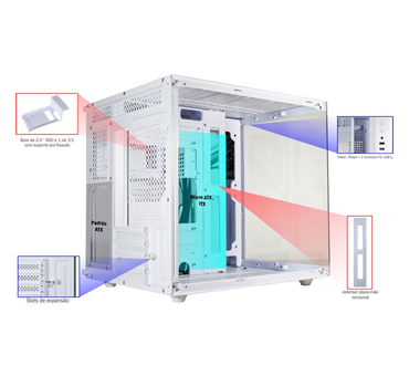 O Gabinete Gamer AQUÁRIO MICRO WHITE CG-W2SB combina design sofisticado em vidro temperado com alta funcionalidade em um formato compacto. Ideal para quem busca desempenho em setups Micro ATX e ITX sem abrir mão da estética clean em branco.