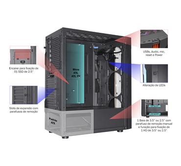Compatível com placas-mãe ATX, Micro ATX e ITX, o CG-01A9 oferece amplo espaço interno, suporte para placas de vídeo de até 280mm e refrigeração otimizada com múltiplas opções de instalação de fans ou water cooler.