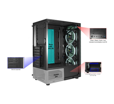 O Gabinete Gamer CG-30C5 foi projetado para oferecer desempenho, estilo e praticidade para quem busca montar um setup de alto nível. Com design moderno e lateral em vidro temperado, ele permite a visualização completa dos componentes internos, realçando efeitos de iluminação RGB e dando um toque sofisticado ao ambiente gamer. Sua estrutura é compatível com placas-mãe ATX, Micro ATX e ITX, garantindo flexibilidade na montagem. Além disso, conta com excelente fluxo de ar, suportando múltiplos fans para refrigeração eficiente, filtros anti-poeira de fácil remoção e espaço otimizado para gerenciamento de cabos. Robustez, estética e funcionalidade em um único gabinete.