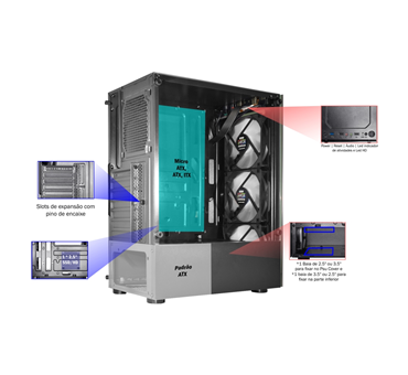 O Gabinete Gamer Elite Rainbow - CG-20W5 combina desempenho, praticidade e estilo em um só produto. Projetado para oferecer excelente circulação de ar e compatibilidade com diferentes configurações, ele possui lateral em vidro temperado que valoriza os componentes internos e evidencia a iluminação RGB, garantindo um visual moderno e imersivo. Com suporte para múltiplas placas-mãe, slots de expansão e baias de armazenamento, é ideal para quem busca montar um setup versátil e preparado para upgrades. Além disso, seu design robusto e iluminação vibrante tornam o gabinete a escolha perfeita para quem deseja aliar funcionalidade e estética gamer.