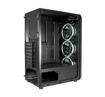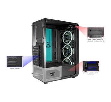 Compatível com placas-mãe ATX, Micro ATX e ITX, suporta placas de vídeo de até 290mm e coolers de até 160mm. Possui painel lateral em vidro temperado e acompanha 3 fans frontais multicolor, garantindo visual gamer e fluxo de ar eficiente.