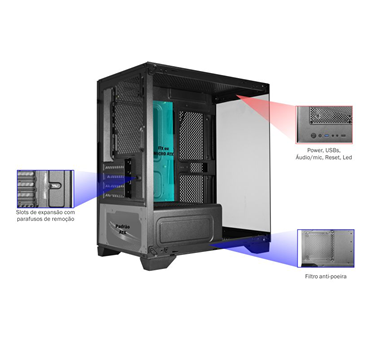 Compatível com placas-mãe Micro ATX e ITX, o CG-W1AG oferece suporte para placas de vídeo de até 300mm e coolers de até 160mm. Além disso, permite instalação de múltiplos fans ou water coolers, garantindo fluxo de ar adequado em qualquer configuração.