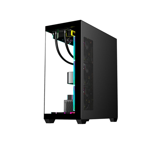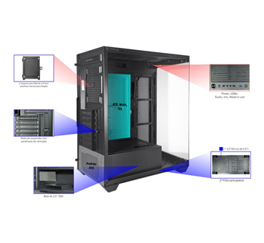 O Gabinete Gamer Torre Negra ATX CG-36DY foi projetado para oferecer máximo desempenho e praticidade na montagem do seu setup. Compatível com placas-mãe ATX, Micro ATX e ITX, ele conta com amplo espaço interno para acomodar placas de vídeo robustas e múltiplas unidades de armazenamento em diferentes formatos. Sua estrutura é reforçada e possui slots de expansão estratégicos, facilitando upgrades futuros e garantindo flexibilidade para diferentes configurações. Além disso, o gabinete apresenta design moderno e funcional, com áreas dedicadas ao fluxo de ar e suporte a sistemas de refrigeração, proporcionando estabilidade e eficiência mesmo em longas sessões de uso.