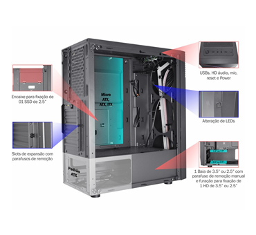 O Gabinete Gamer Yaiba IV - CG-10AA é a escolha perfeita para quem busca estilo, funcionalidade e espaço interno otimizado em um único produto. Com design moderno e agressivo, ele apresenta lateral em vidro temperado que valoriza a iluminação interna e destaca cada detalhe da sua configuração. Compatível com placas-mãe ATX, Micro ATX e ITX, oferece excelente suporte para múltiplos SSDs e HDDs, além de slots de expansão para upgrades futuros. Seu sistema de ventilação é eficiente, preparado para receber múltiplos fans e radiadores, garantindo temperaturas controladas mesmo durante longas sessões de jogos. Com painel frontal completo, incluindo portas USB, áudio e botões de fácil acesso, o Yaiba IV une praticidade, desempenho e visual gamer em um gabinete robusto e confiável.