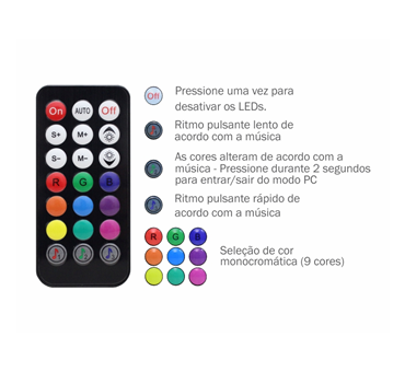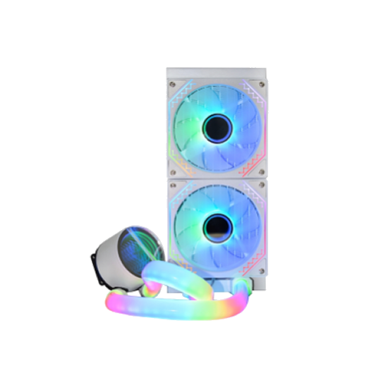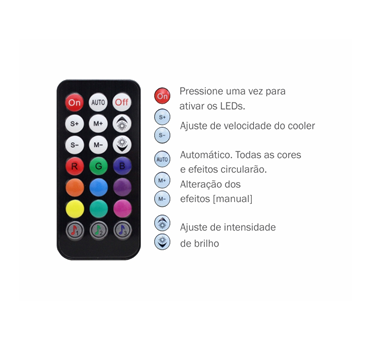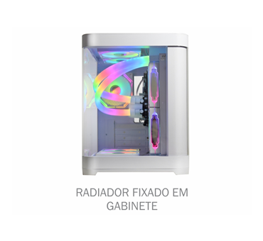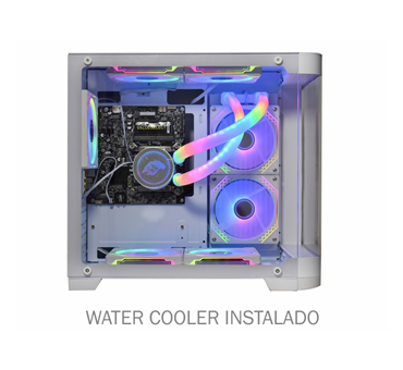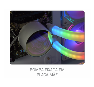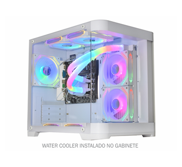 Combina as vantagens do Water Cooler e do Fan Cooler em um só produto, com LEDs ARGB Rainbow, 9 lâminas resistentes, baixo ruído e eficiente dissipação de calor, garantindo temperaturas seguras para processador e interior do sistema, aliado a uma estrutura robusta com amortecedores de impacto e 1 ano de garantia (exceto bateria do controle remoto).