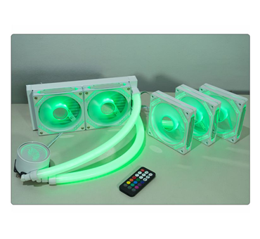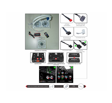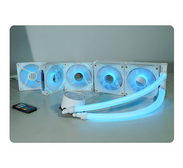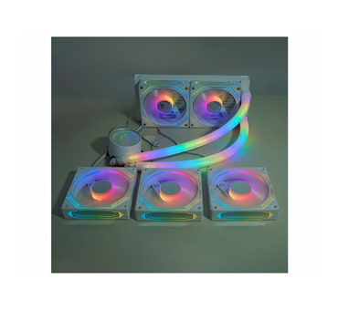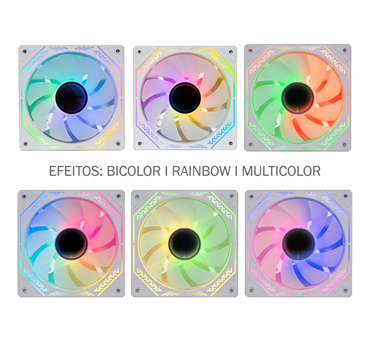 Produto com 1 ano de garantia (exceto bateria do controle remoto), estrutura branca com amortecedor de impacto, LEDs ARGB Rainbow, 9 lâminas resistentes, baixo ruído, alta refrigeração, eficiente dissipação de calor do processador e interior do sistema, mantendo temperaturas seguras, unindo as características de Water Cooler e Fan Cooler.