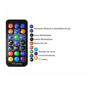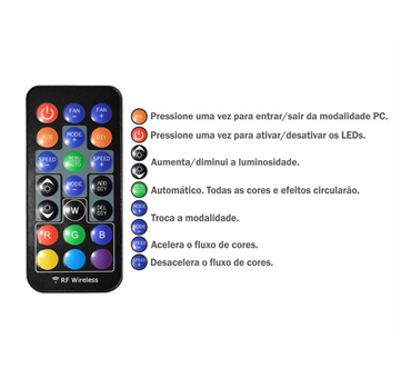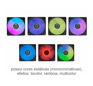 Este cooler combina alto desempenho térmico com visual moderno e silencioso. Conta com estrutura preta resistente e amortecedores de impacto nas extremidades, garantindo durabilidade e estabilidade. Suas 09 lâminas otimizam o fluxo de ar, oferecendo alta refrigeração com baixo ruído. O destaque fica por conta da iluminação ARGB rainbow, que traz estilo ao setup. Para maior segurança, possui 01 ano de garantia, exceto para a bateria do controle remoto.
