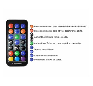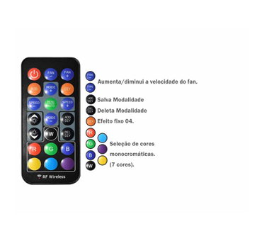 Com estrutura translúcida branca e amortecedores de impacto nas extremidades, este cooler alia durabilidade e estabilidade. Suas 09 lâminas garantem alta refrigeração com baixo ruído, mantendo a performance ideal dos componentes. A iluminação ARGB rainbow adiciona um visual vibrante e personalizável, enquanto o material resistente assegura longa vida útil. Para maior tranquilidade, conta com 01 ano de garantia (exceto para a bateria do controle remoto).