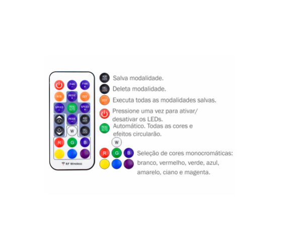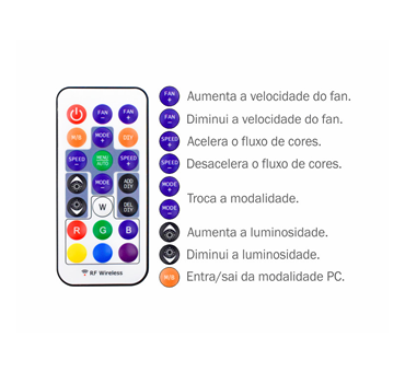 Controle remoto sem fio que permite ajustar velocidade dos fans, intensidade da iluminação, modos de cor e efeitos visuais, trazendo total liberdade para personalizar o setup.