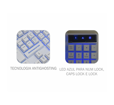 Conta com antighosting para comandos mais rápidos e precisos, além de indicadores em LED azul para Num Lock, Caps Lock e Scroll Lock.