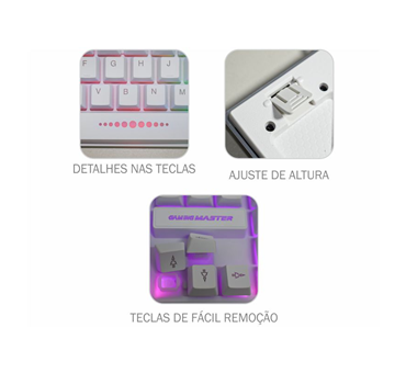 Teclas de fácil remoção para limpeza, ajuste de altura para melhor ergonomia e detalhes iluminados que valorizam o setup.