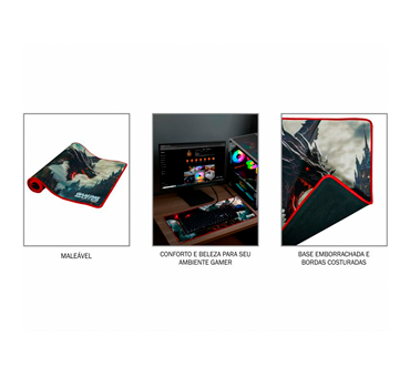 Estampa exclusiva inspirada em dragões, ele proporciona uma experiência imersiva para os gamers que buscam performance e personalidade. As bordas costuradas aumentam a durabilidade e evitam o desgaste, tornando-o a escolha ideal para longas sessões de jogo.