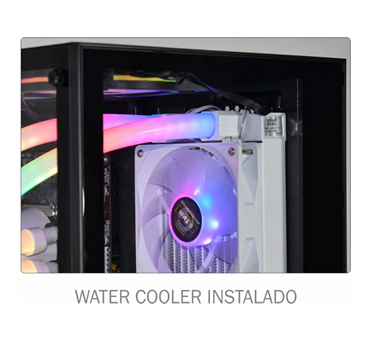 As mangueiras e ventoinhas com iluminação ARGB criam um visual moderno e personalizável, transformando o setup em uma verdadeira obra de arte gamer.