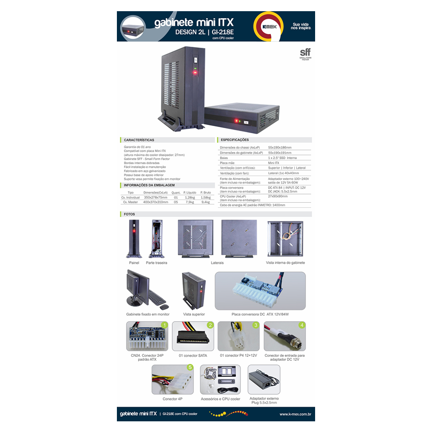 O Gabinete 2L com Placa Conversora e CPU Cooler é compacto, silencioso e eficiente, oferecendo refrigeração confiável e suporte ideal para aplicações que exigem desempenho estável em pouco espaço.